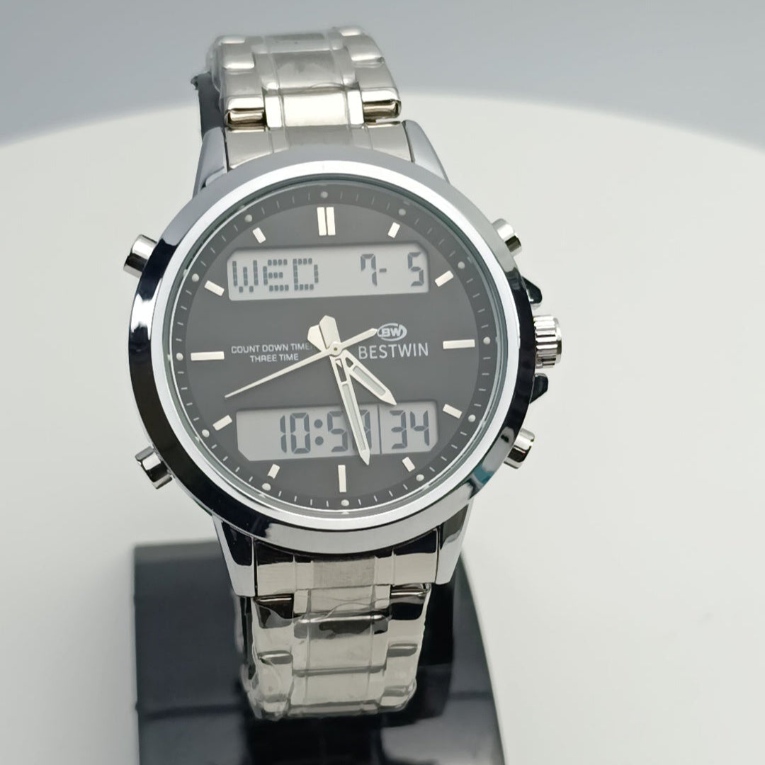 Discover the perfect fusion of style and utility with the Bestwin 219 Golden-Silver Edition – a premium analog-digital wristwatch designed for active lifestyles. With elegant metallic tones, Japanese movement, and multi-functional digital features, it’s the ideal choice for Gentlemen.