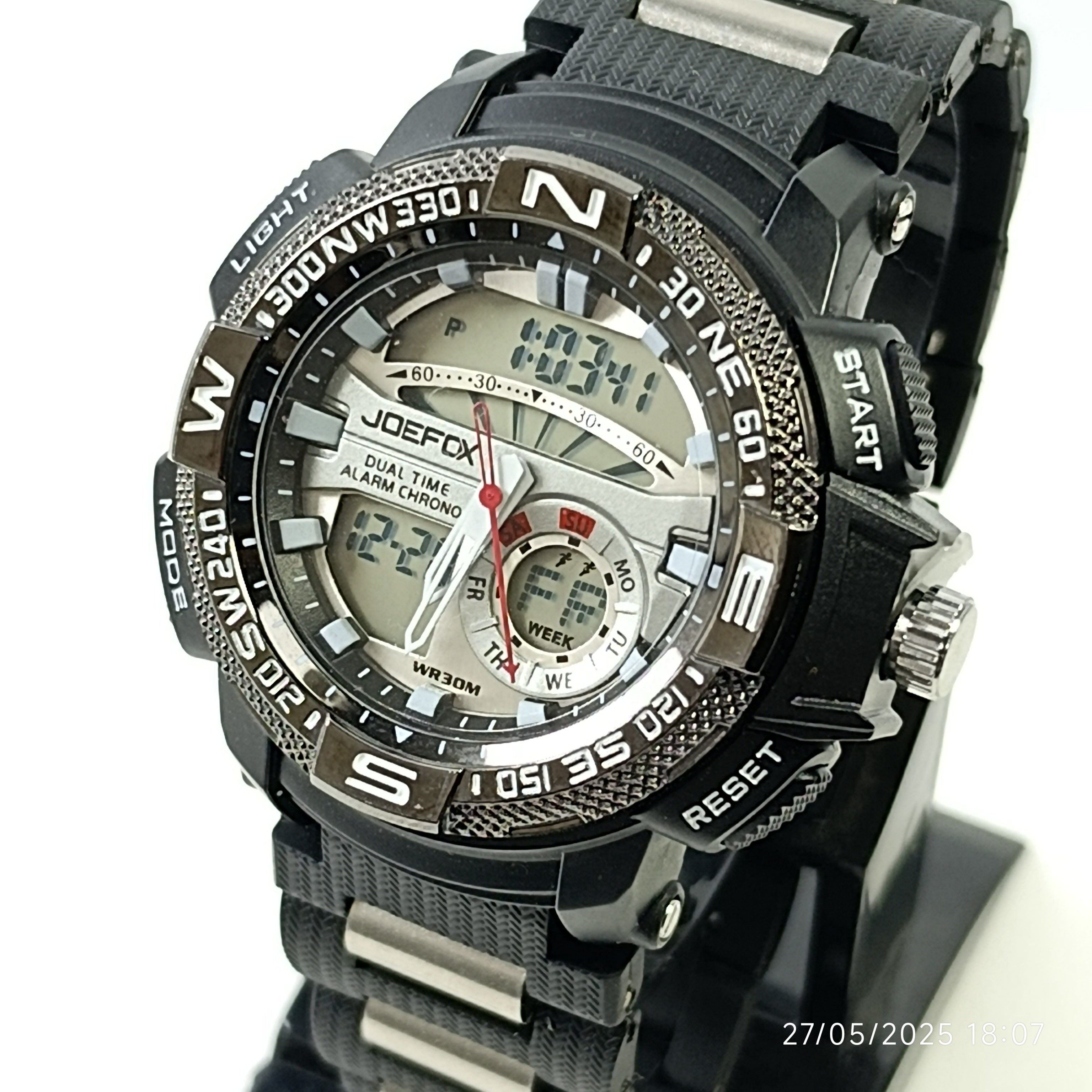 🕒 Dual Display (Analog + Digital) – Time, day, alarm, stopwatch & backlight – all in one